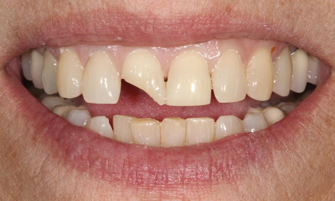 Sandy had the side walk come out and grabbed her leg causing her to fall and chip her front tooth. The fragment was saved and glued back to her tooth for years but the fracture line was obvious and the color started to change. The before picture was what was left after the fractured fragment was reemoved. You can appreciate the amount of tooth that was lost in the before picture. I was able to restore the tooth with composite bonding and create a seamless filling that is undectable with the human eye at a social distance. Sandra gave me a nice big hug after this was done!